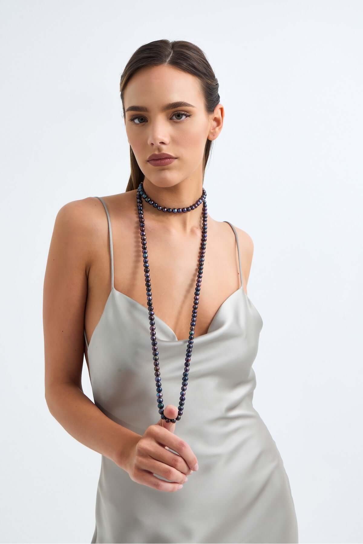 Siyah Doğal İnci Sıralı Kolye Bileklik Küpe Üçlü Set