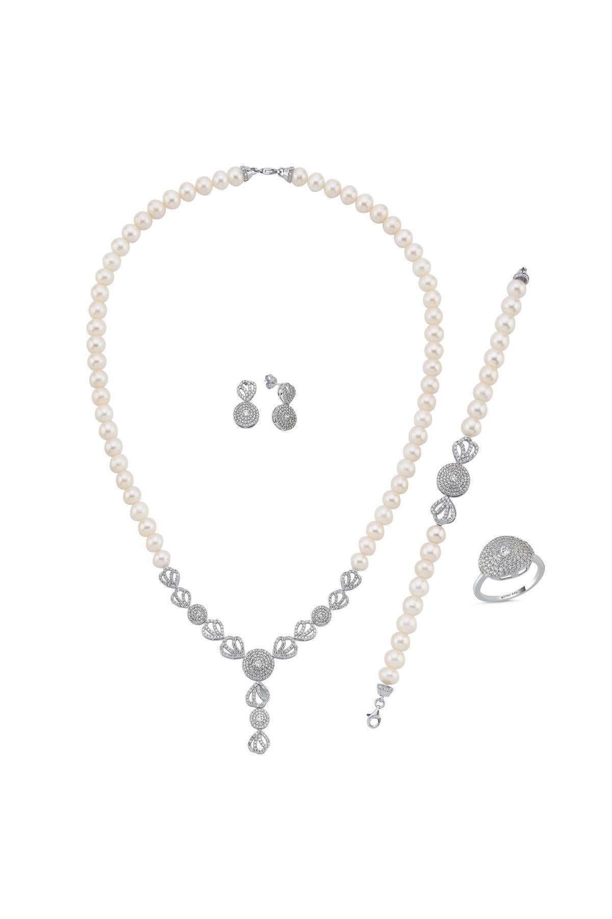 Zirkon Taşlı İnci Kolye Bilelik Küpe Yüzük Dörtlü Set