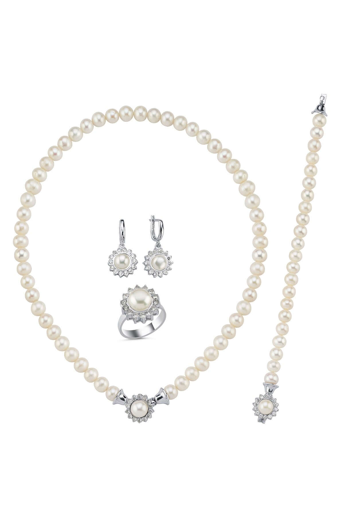 Papatya Zirkon Taşlı Doğal İnci Kolye Bileklik Küpe Yüzük Dörtlü Set
