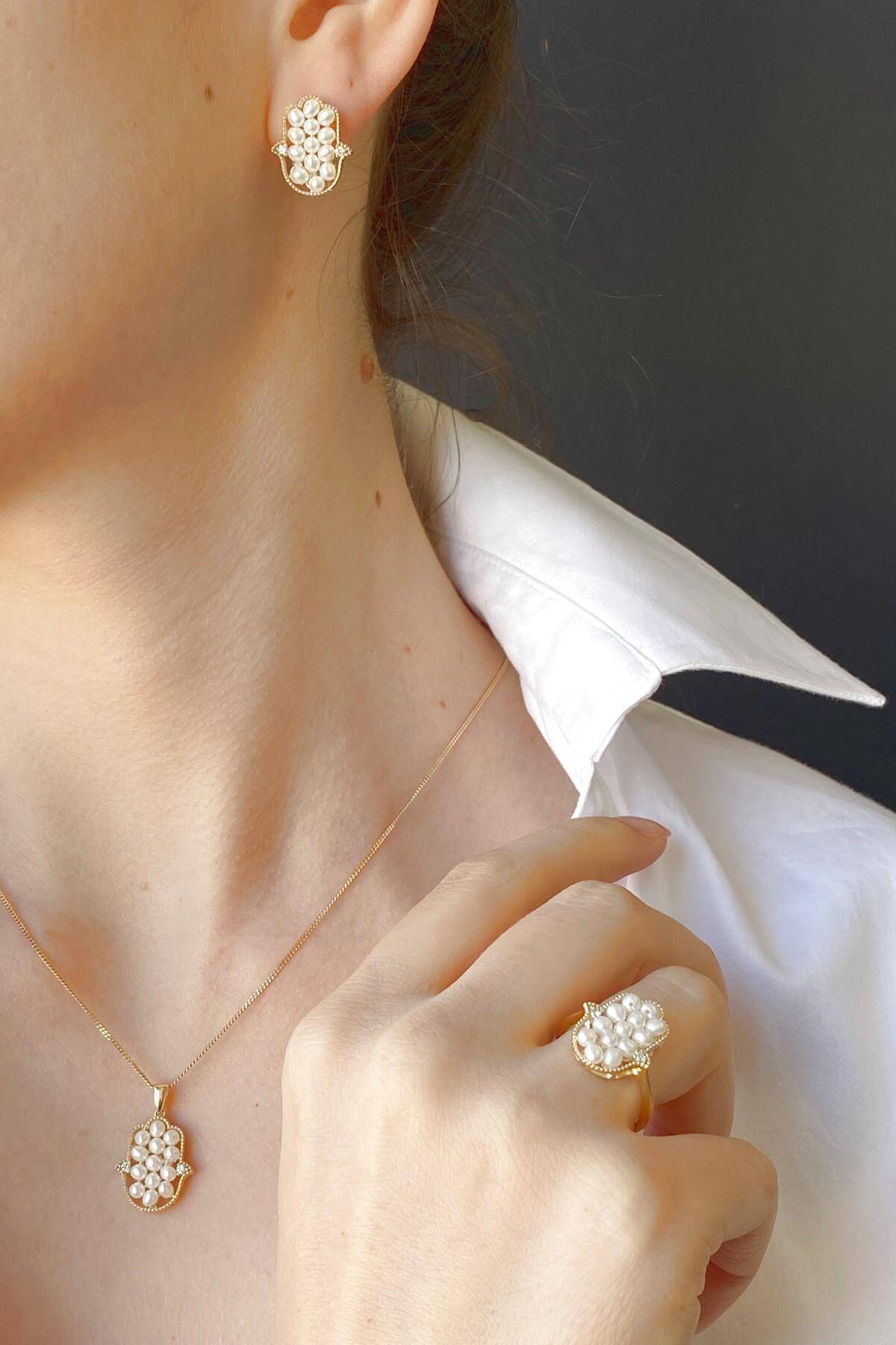 Fatma Elli Doğal İnci 0,35 Karat Pırlanta Küpe Kolye Yüzük Üçlü Set