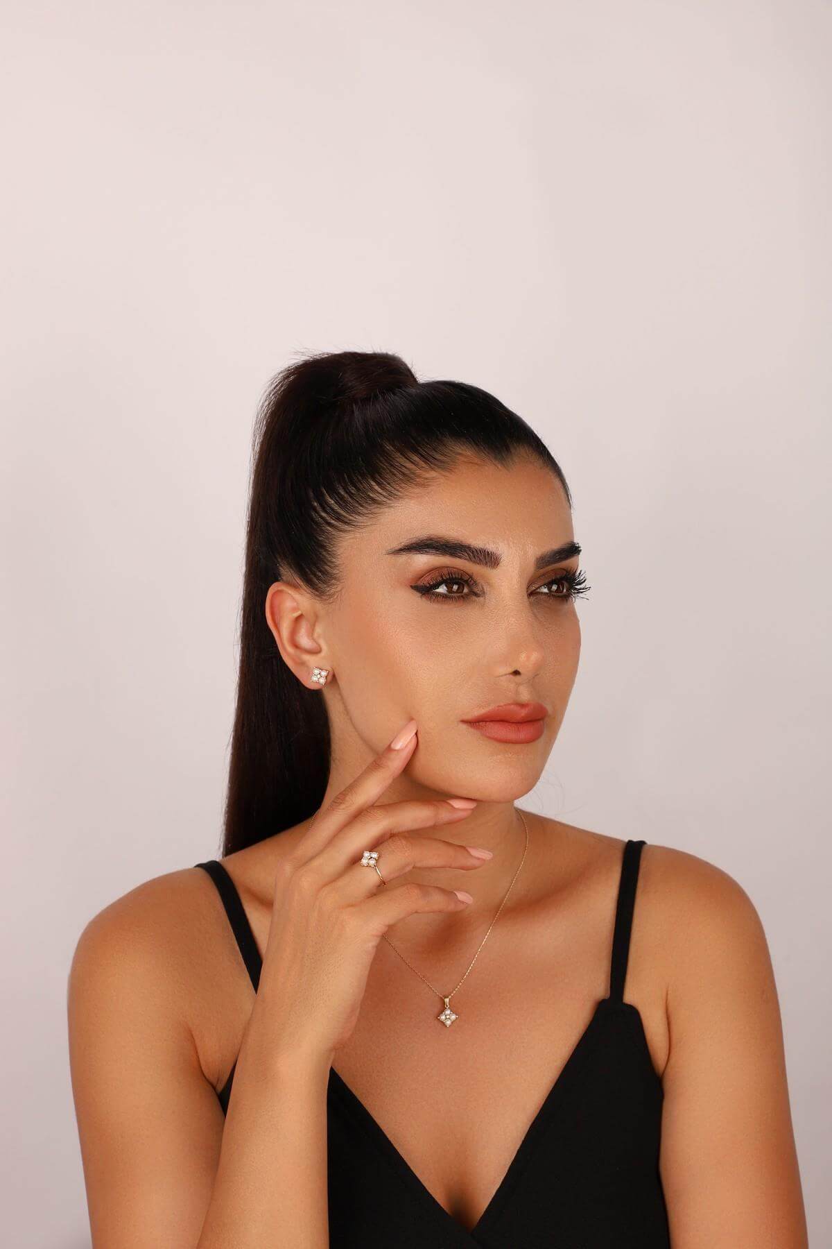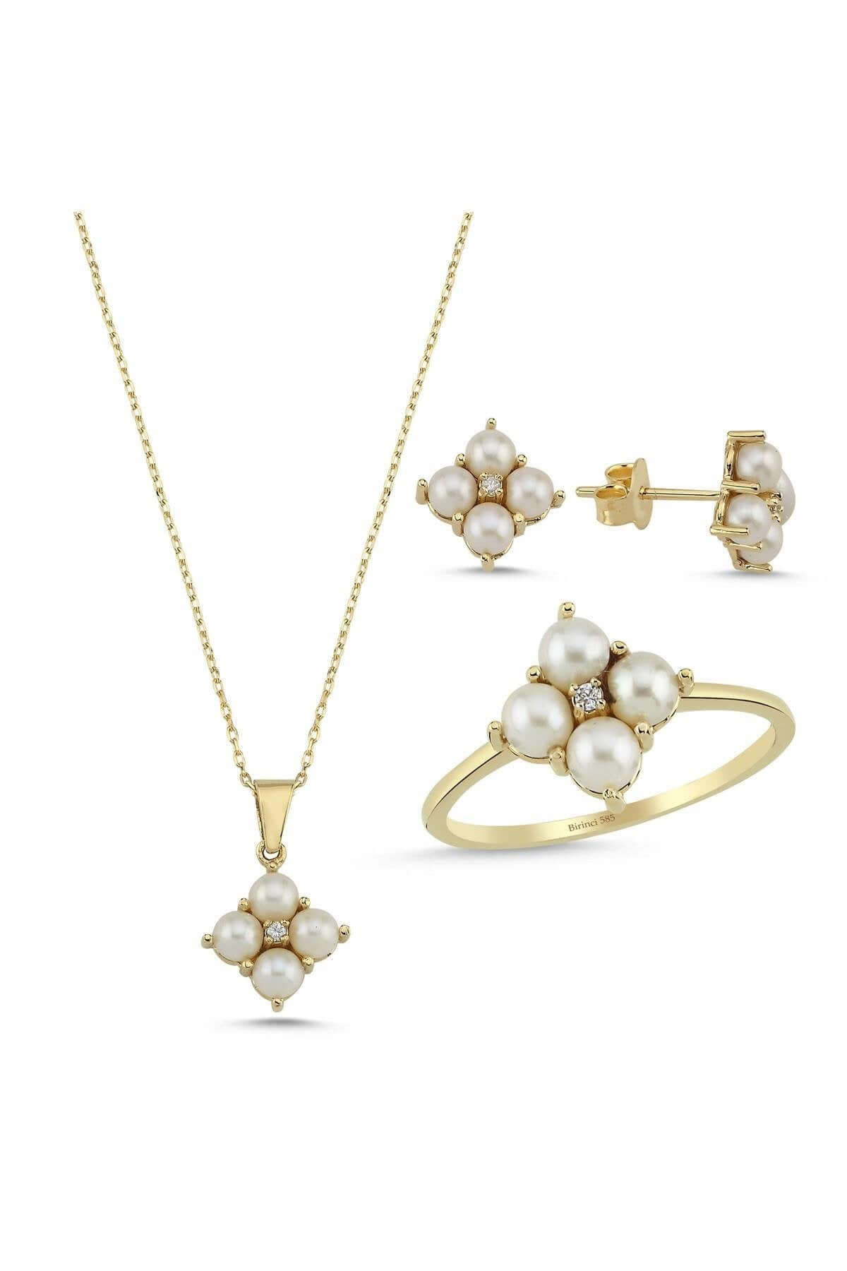 Dört Doğal İncili 0,24 Karat Pırlanta Küpe Kolye Yüzük Üçlü Set