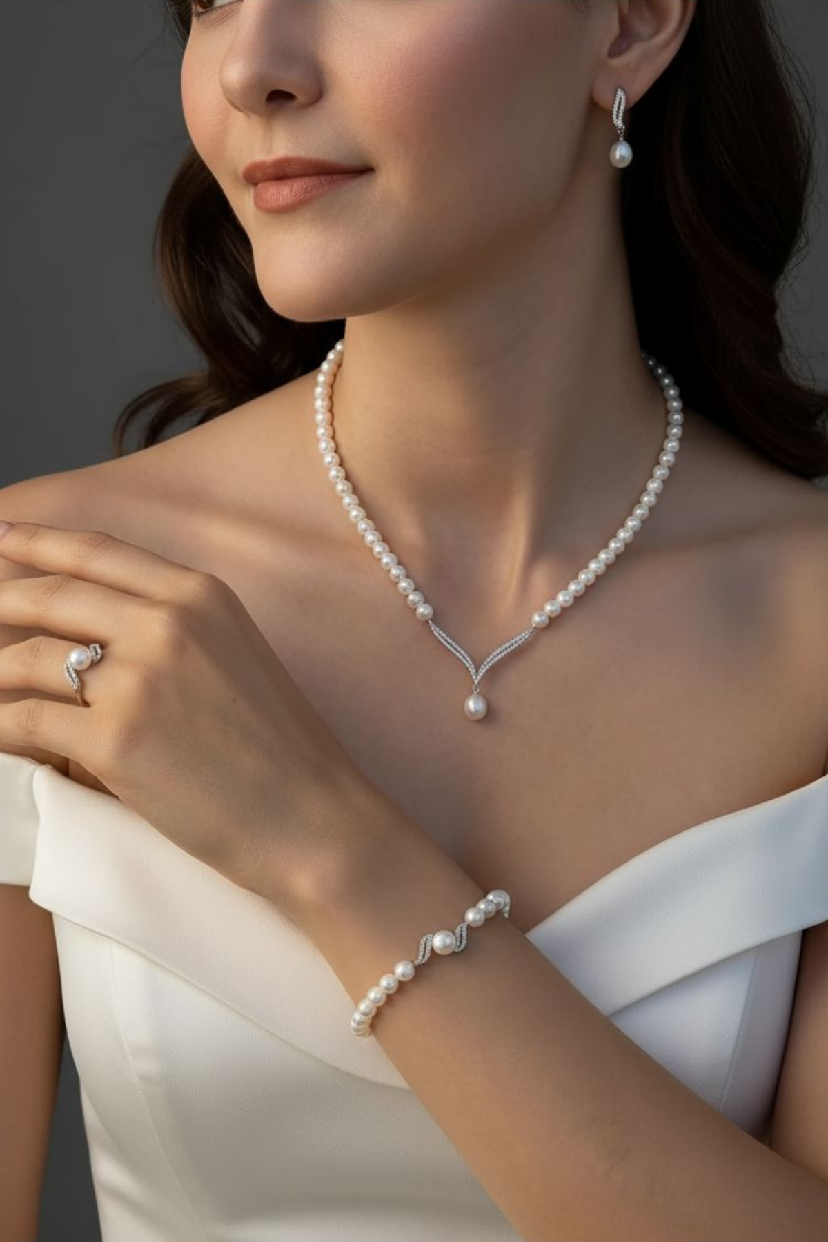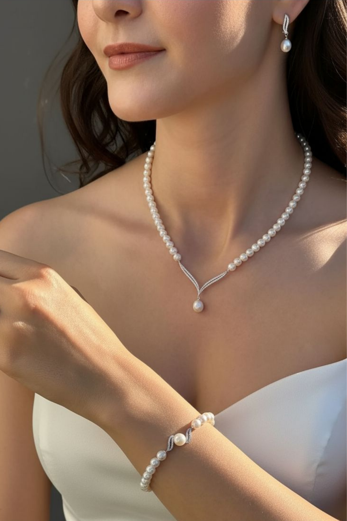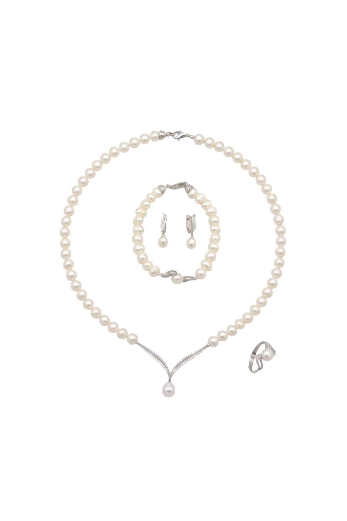 Birinci1926 tasarımı bu zarif set, doğal incinin zamansız ışıltısını 925 ayar gümüşün parlaklığıyla buluşturur.; Kolye, bileklik, yüzük ve küpeden oluşan bu özel set; düğün, nişan ve davet gibi özel günlerde şıklığınızı tamamlar.; İnci detaylarının yumuşak parlaklığı, hareket ettikçe ışığı yansıtarak sofistike bir görünüm sunar.; Kolye 45 cm uzunluğunda olup ortadaki sallantılı inci detayı ile boyun hattına zarif bir vurgu yapar.; Bileklik 18 cm ölçüsüyle bileğinizi şık bir şekilde sarar.; Küpeler ise zarif sallantılı tasarımıyla setin bütünlüğünü tamamlar.; Yüzük ölçünüzü sipariş sonrası mesaj olarak iletmeniz gerekmektedir.; El işçiliğiyle özenle üretilen bu set, uzun yıllar ilk günkü ışıltısını koruyacak şekilde tasarlanmıştır.; Ürün, özel tasarım kutusunda ve sertifikası ile birlikte şık bir paketleme ile tarafınıza gönderilir.