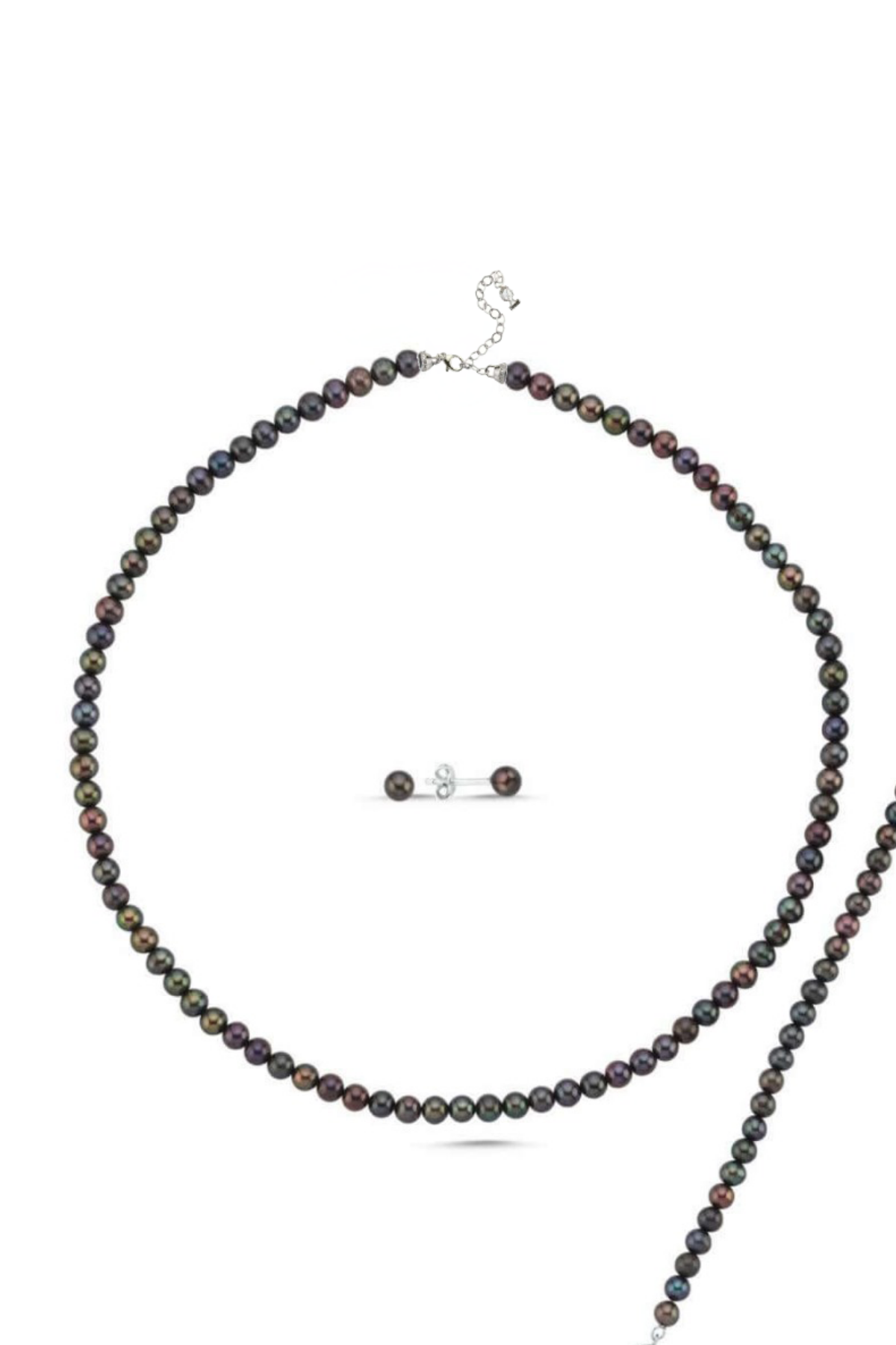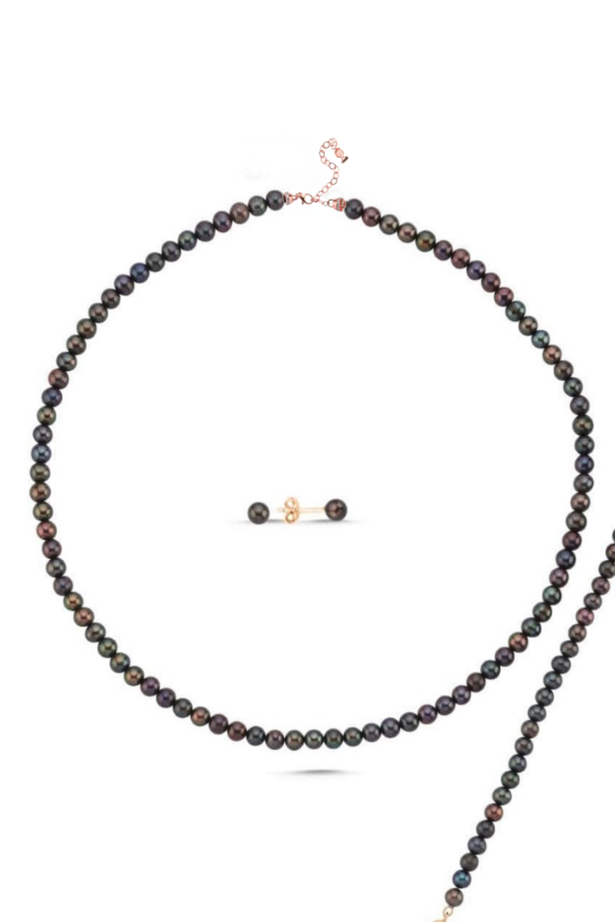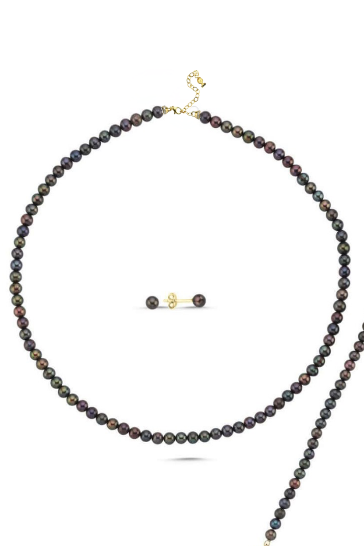 Siyah Doğal İnci Sıralı Kolye Bileklik Küpe Üçlü Set