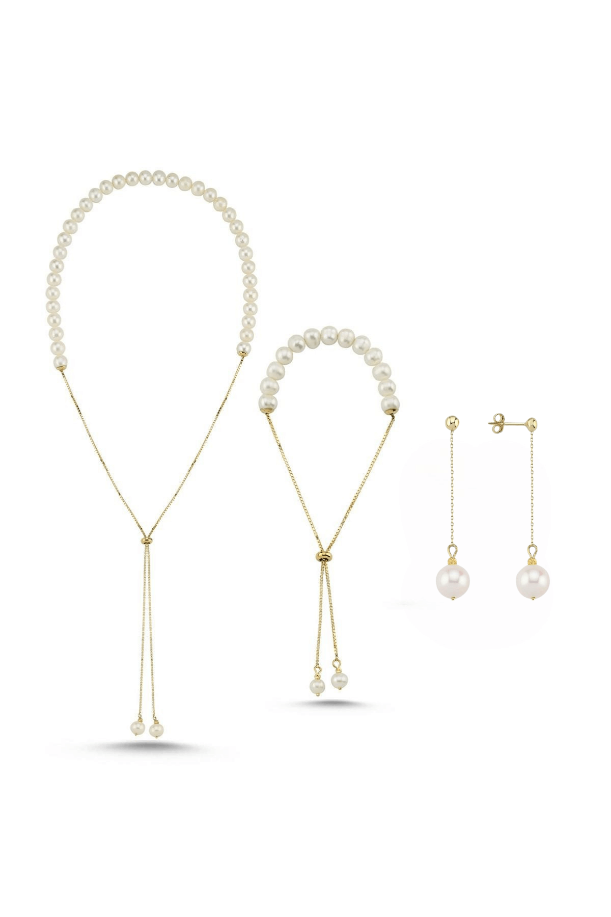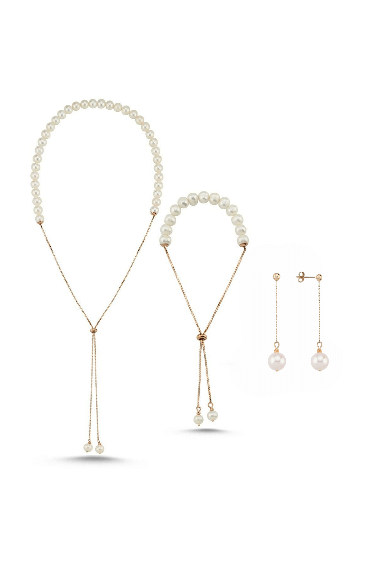 Ürün Adı: 925 Ayar Gümüş Kadın Yarısı Doğal İnci Yarısı Zincir Asansörlü Küpe Kolye Bileklik Üçlü Set