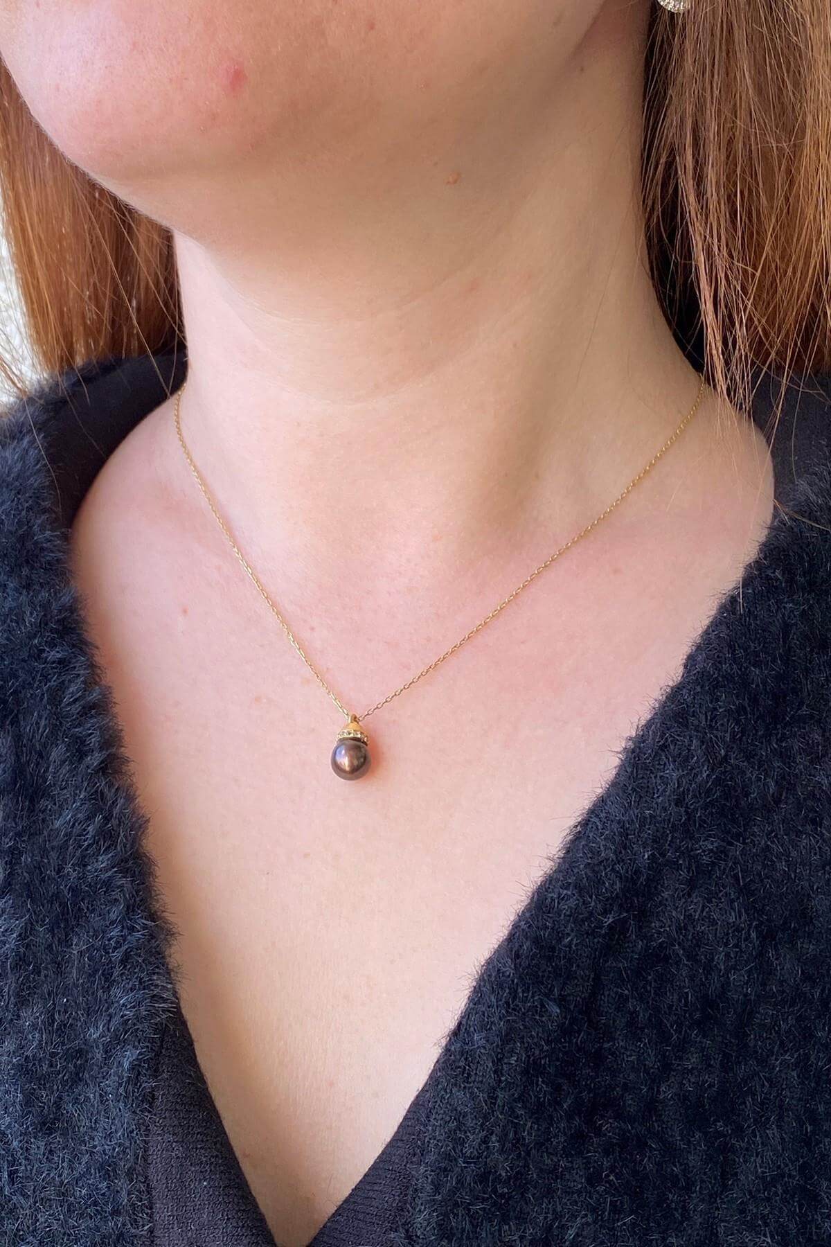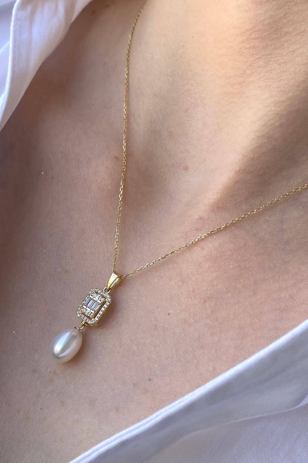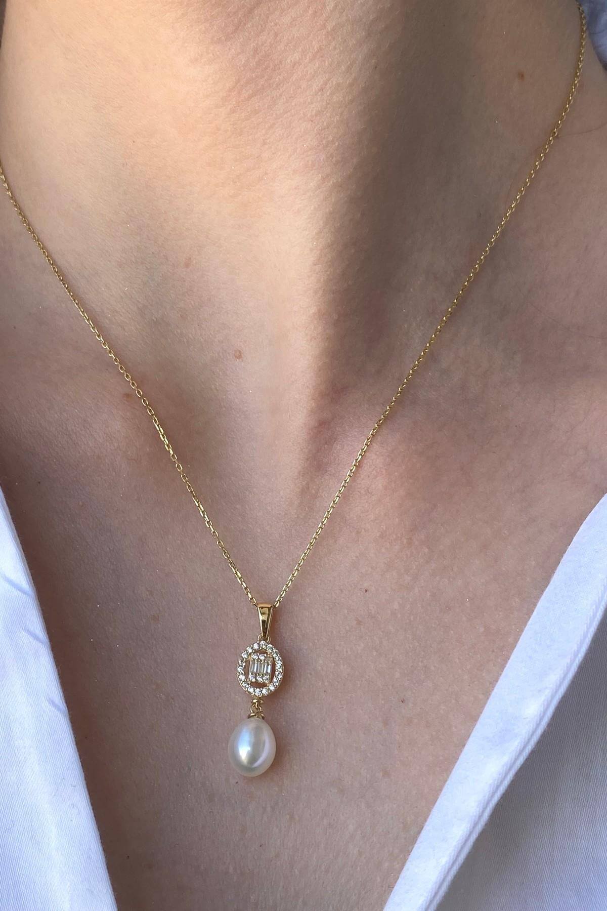 Ürün Adı: 14 Ayar Altın 9 mm Baget Taş Doğal İnci Sallantı Kolye