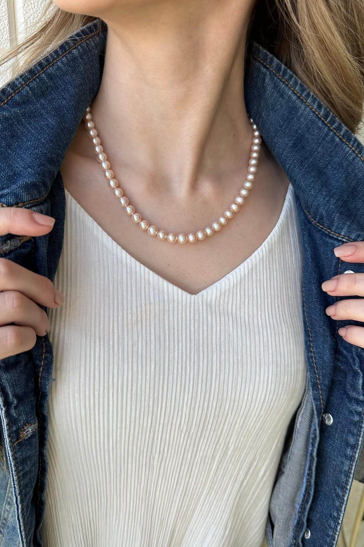 Ürün Adı: 925 Ayar Gümüş Kadın 7 mm Sıralı Doğal İnci Kolye