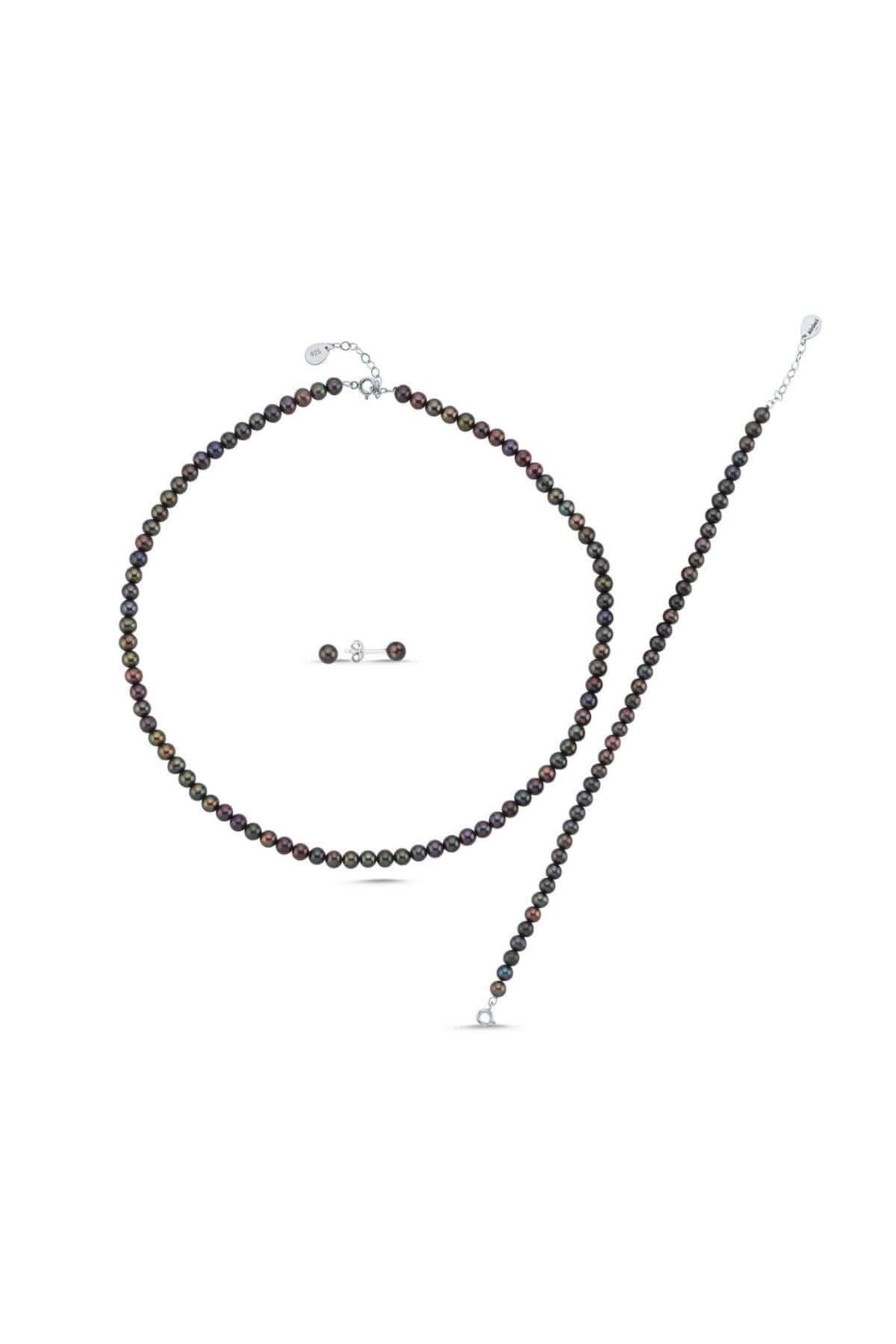Siyah Doğal İnci Sıralı Kolye Bileklik Küpe Üçlü Set | İnci Set | Birinci1926